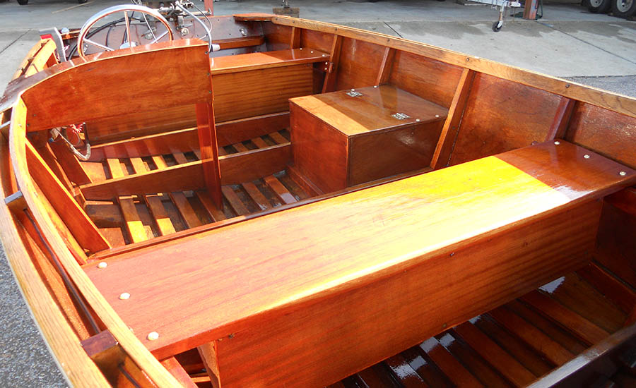 livewells; installing new mahogany non-slip slat floorboards; removal of forward bench
